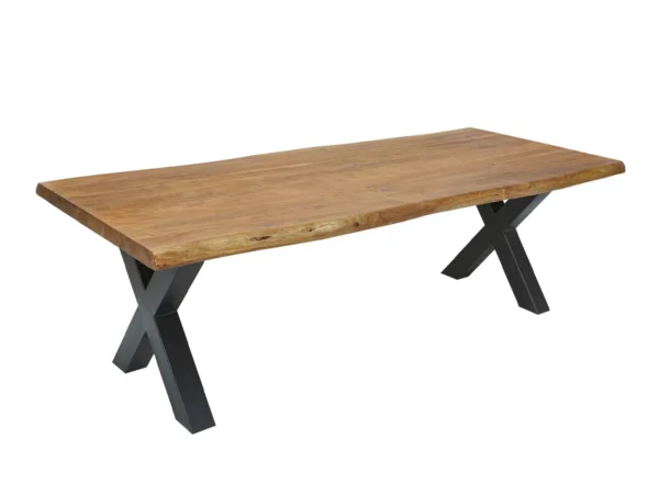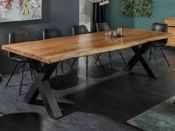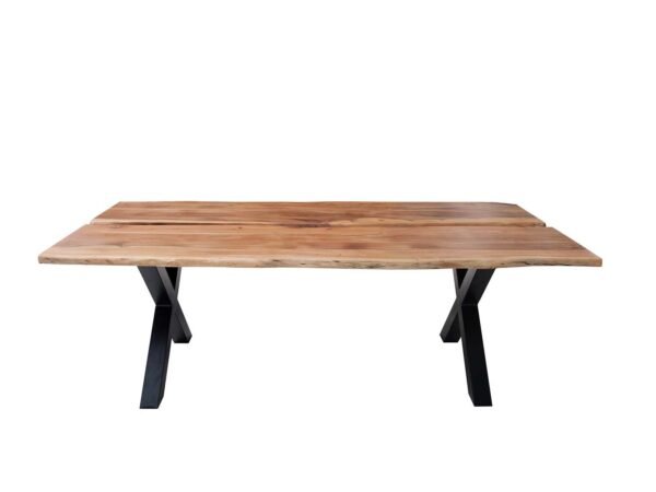 Voici une table à manger en bois d’acacia massif, Cette pièce majestueuse offre un espace généreux pour vos repas et réunions. Le plateau en bois d’acacia met en avant des tons chauds et des motifs de grain uniques, reflétant la beauté naturelle de ce bois robuste et précieux. Chaque plateau a un aspect unique, ce qui signifie que chaque table est une pièce d’art individuelle. Des variations naturelles dans le grain et la couleur du bois font partie du charme de cette table. Le piétement en métal noir, avec son design élégant, contraste avec le bois massif, ajoutant une touche industrielle chic à votre salle à manger.